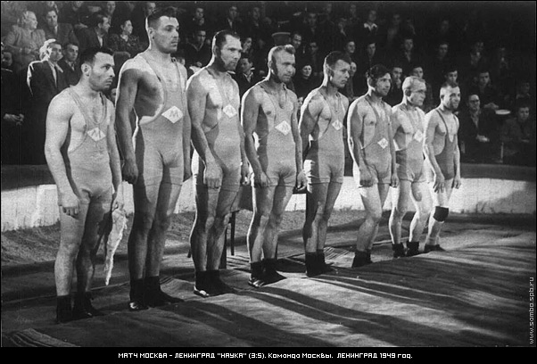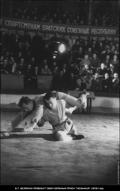 Вадим Тихонович Беляйкин проводит свой коронный приём «мельница» (1949 год)